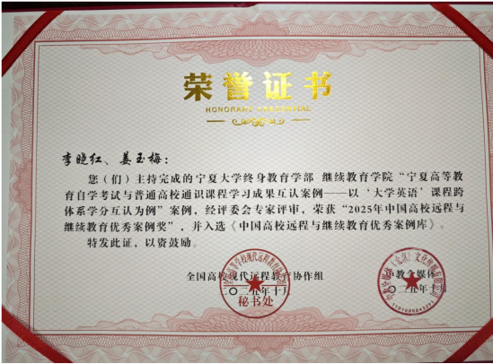 2025年10月29—30日,2025(第十一届)中国远程与继续教育大会在北京举行。由终身教育学部李晓红、姜玉梅共同撰写的《宁夏高等教育自学考试与普通高校通识课程学习成果互认案例——以“大学英语”课程跨体系学分互认为例》案例荣获“2025年中国高校远程与继续教育优秀案例奖”,并入选《中国高校远程与继续教育优秀案例库》。
